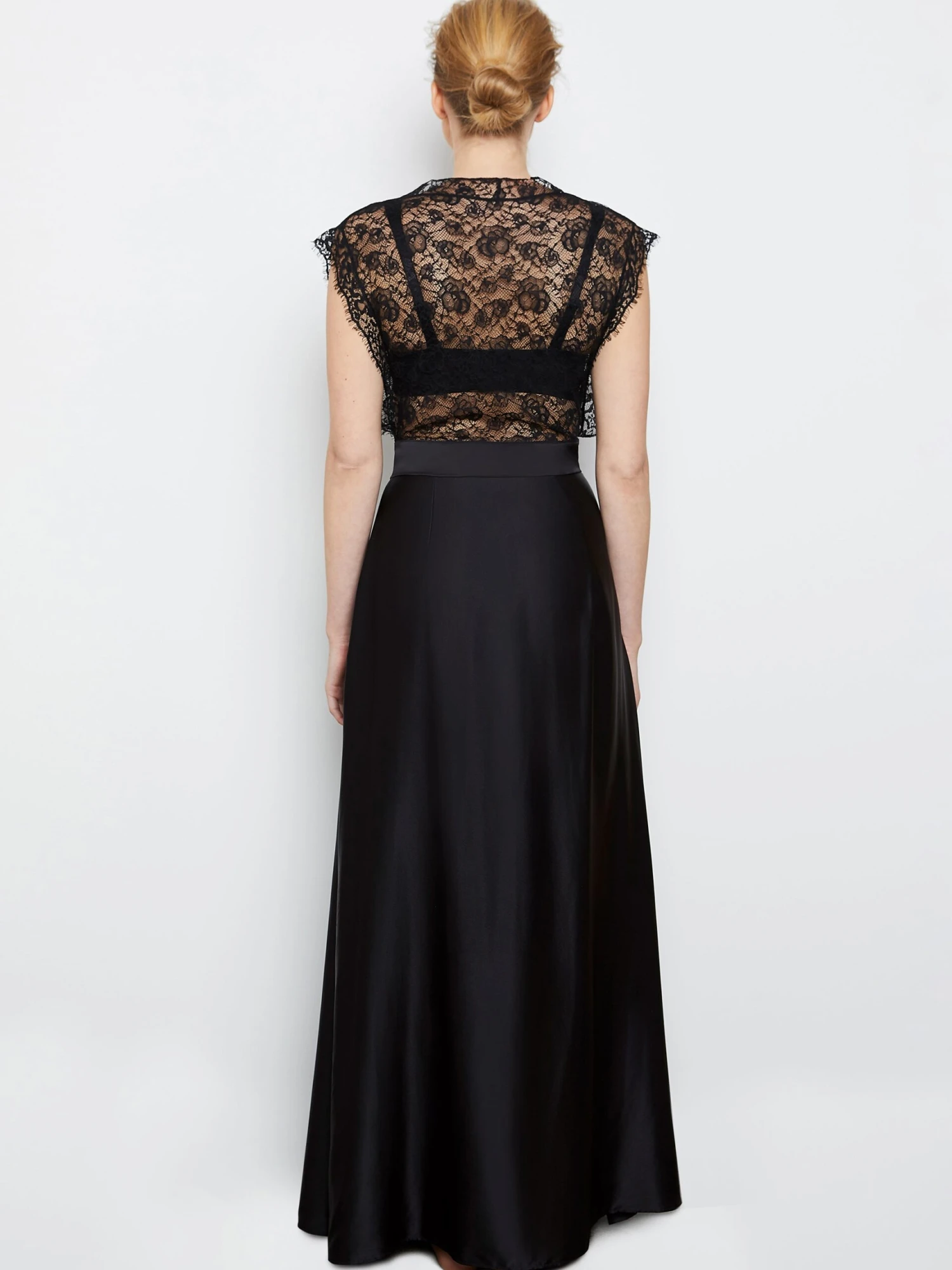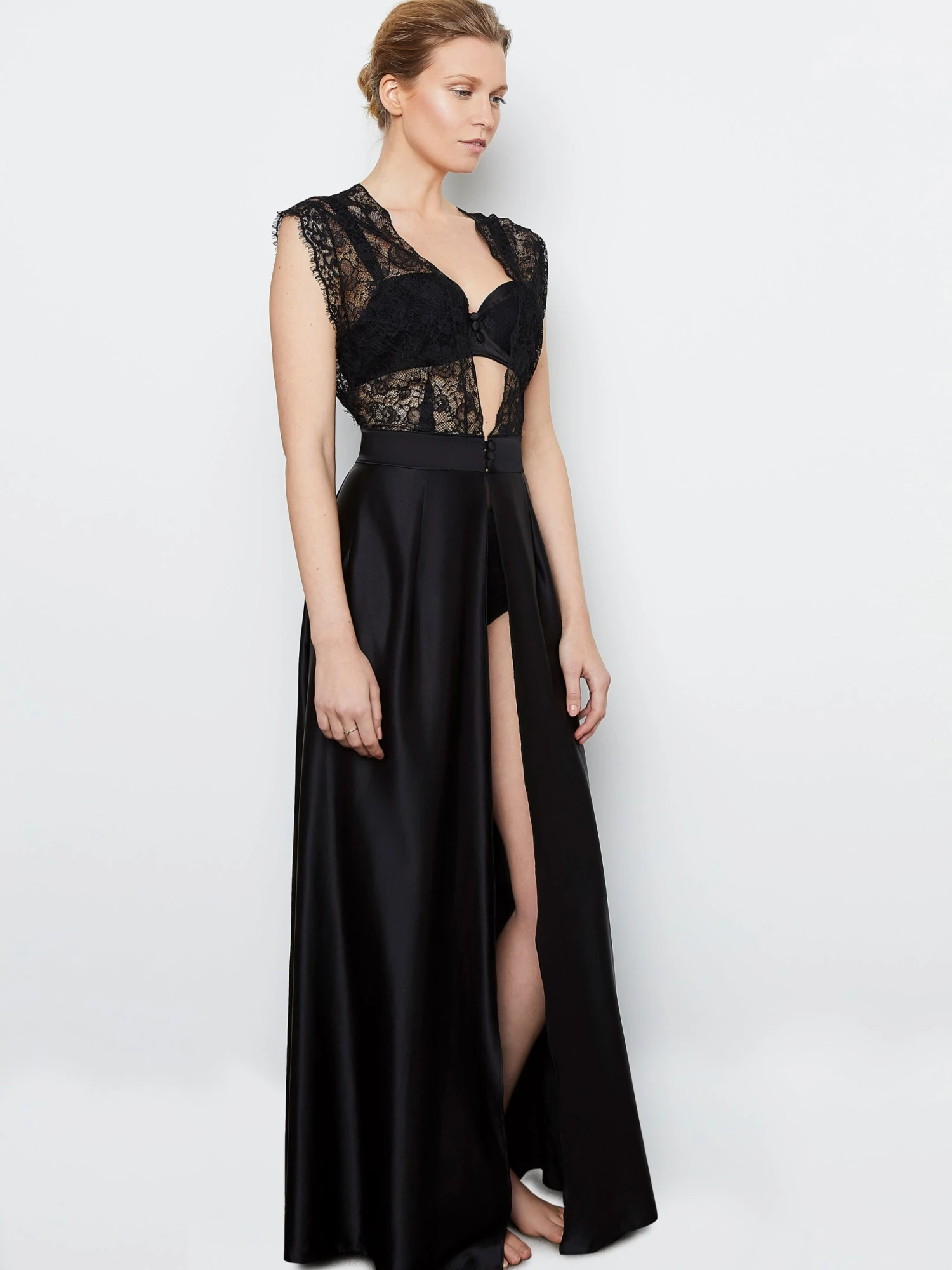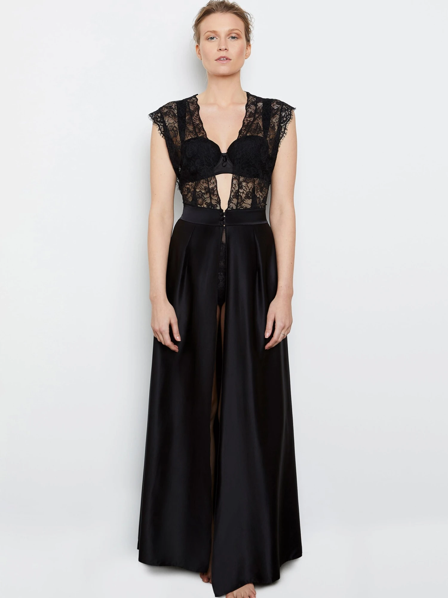 Retro glamour is reimagined in the enduringly elegant Abbie collection. A truly show-stopping piece, the floor length Abbie Black Silk Robe is reminiscent of 1940s Hollywood icons lounging in their dressing rooms. French lace sits beautifully above a billowing silk skirt, which falls elegantly from a cinched waist. Fastened with pure silk buttons, each detail is as decadent as the last.