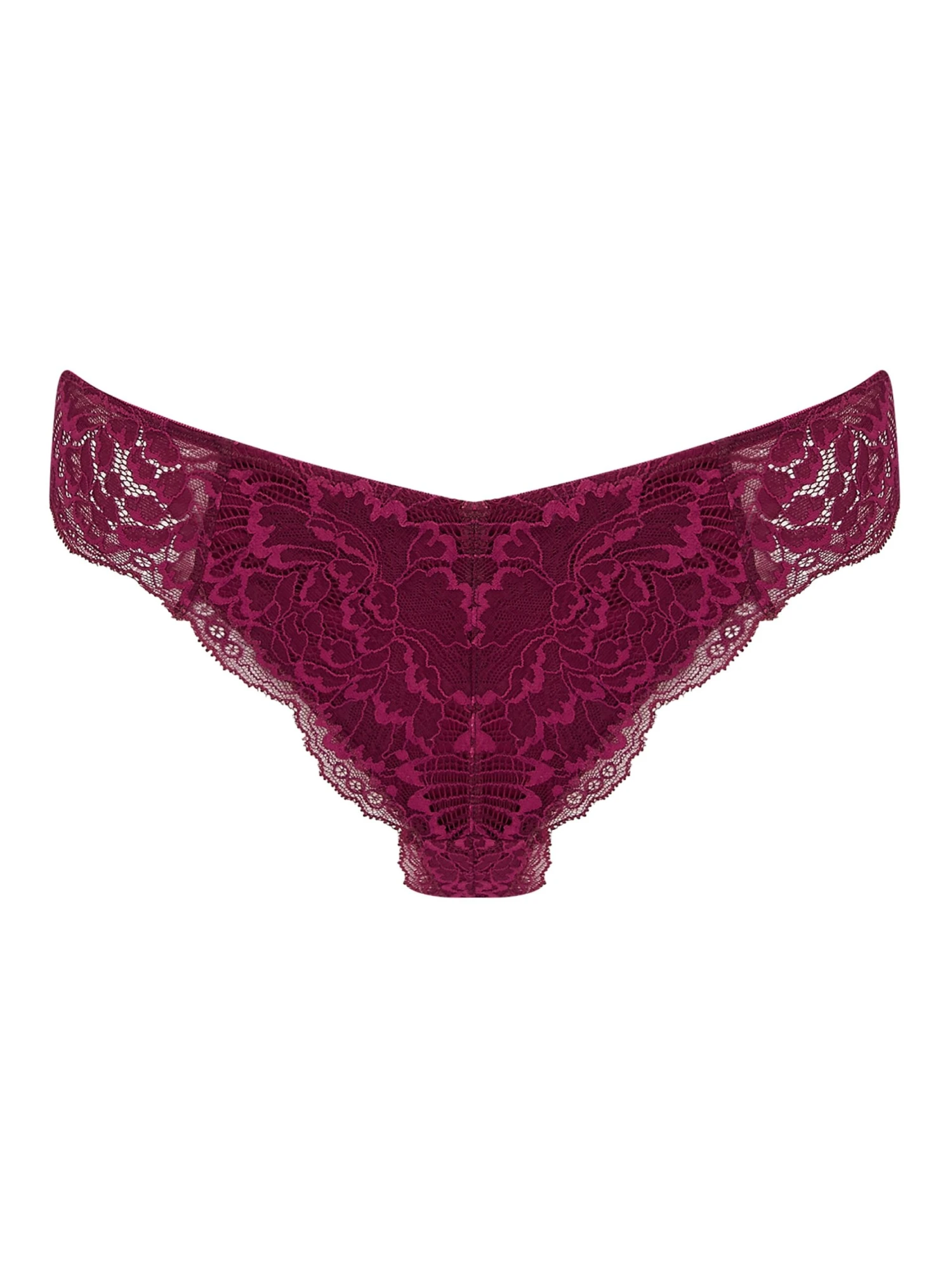 Our Angela boysenberry thong features intricate lace at the front and back for added decadence.
