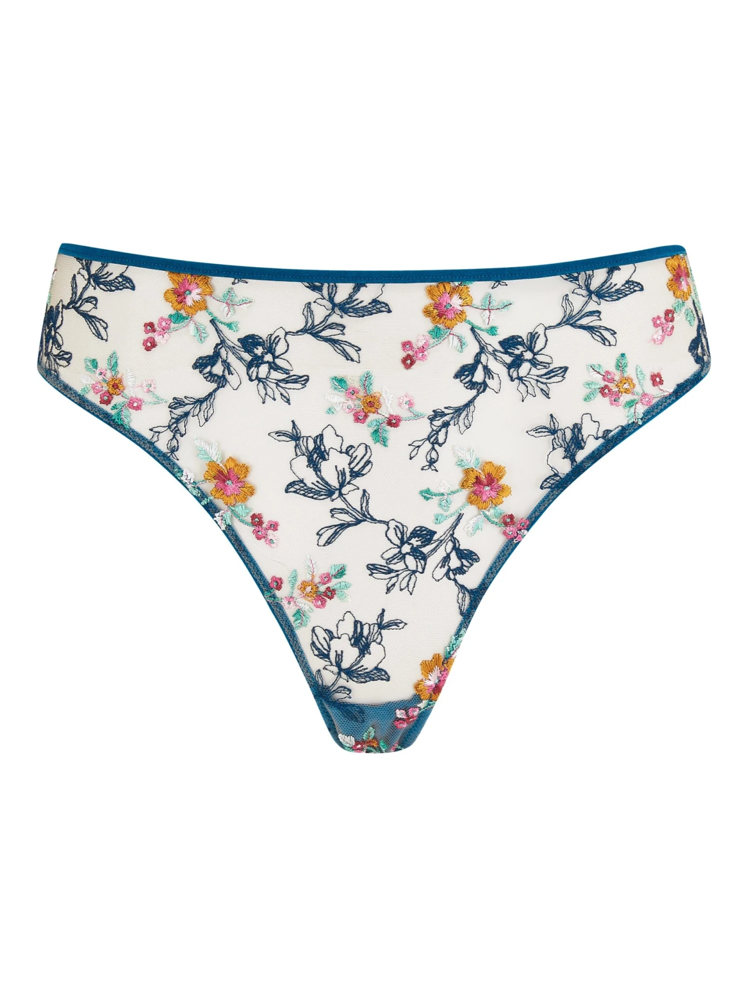 Our delicate Evelyn Cyan Thong is a beautiful example with vibrant floral detailing woven across a luxurious tulle base. A sheer, folded mesh knicker back ensures minimal VPL and maximum comfort.