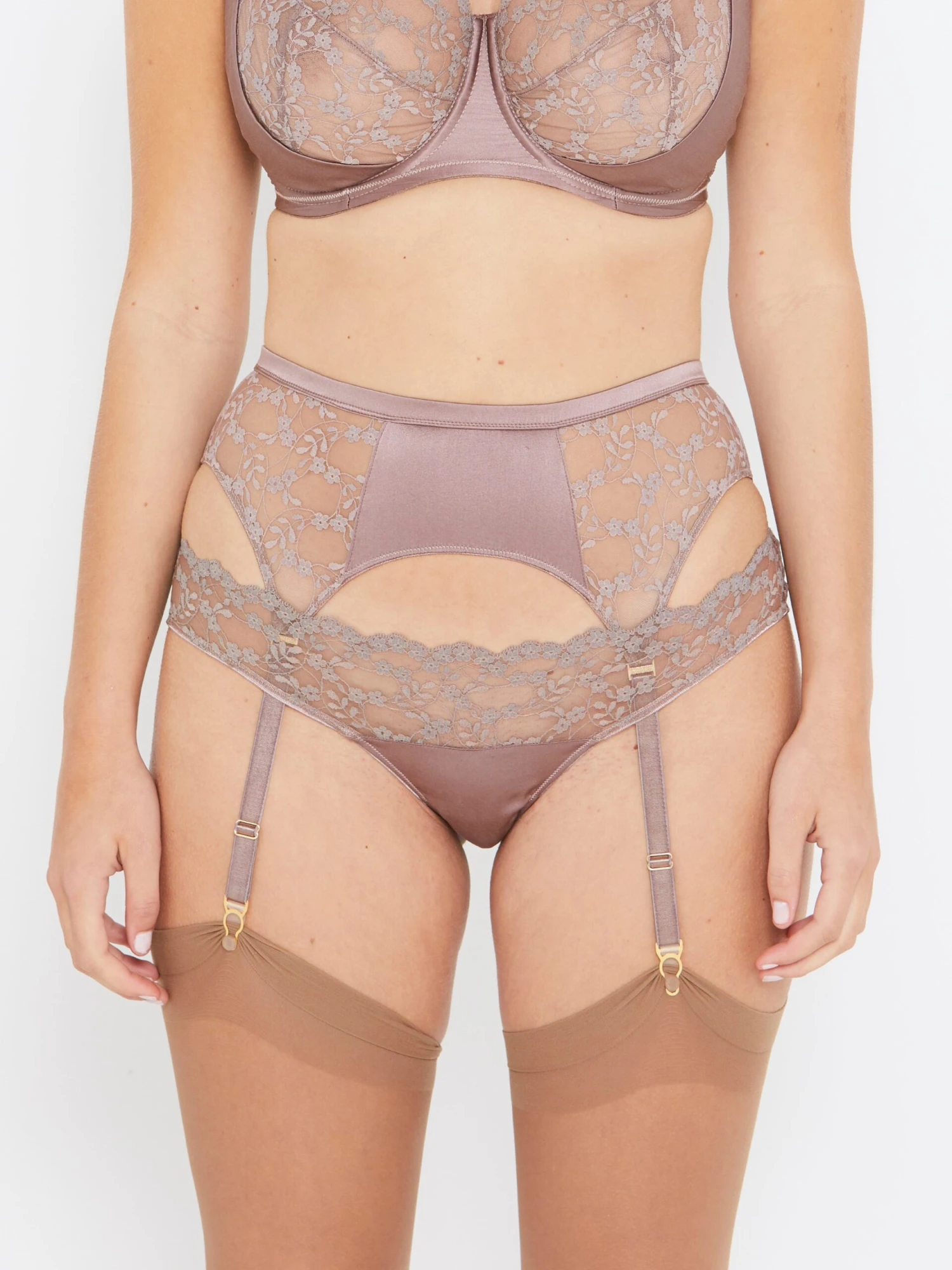 This exquisite suspender belt combines sumptuous silk with intricate café French lace. A luxurious silk panel is framed by the delicate lace, while the silk continues along the waistband, straps, and trims for an elegant touch.